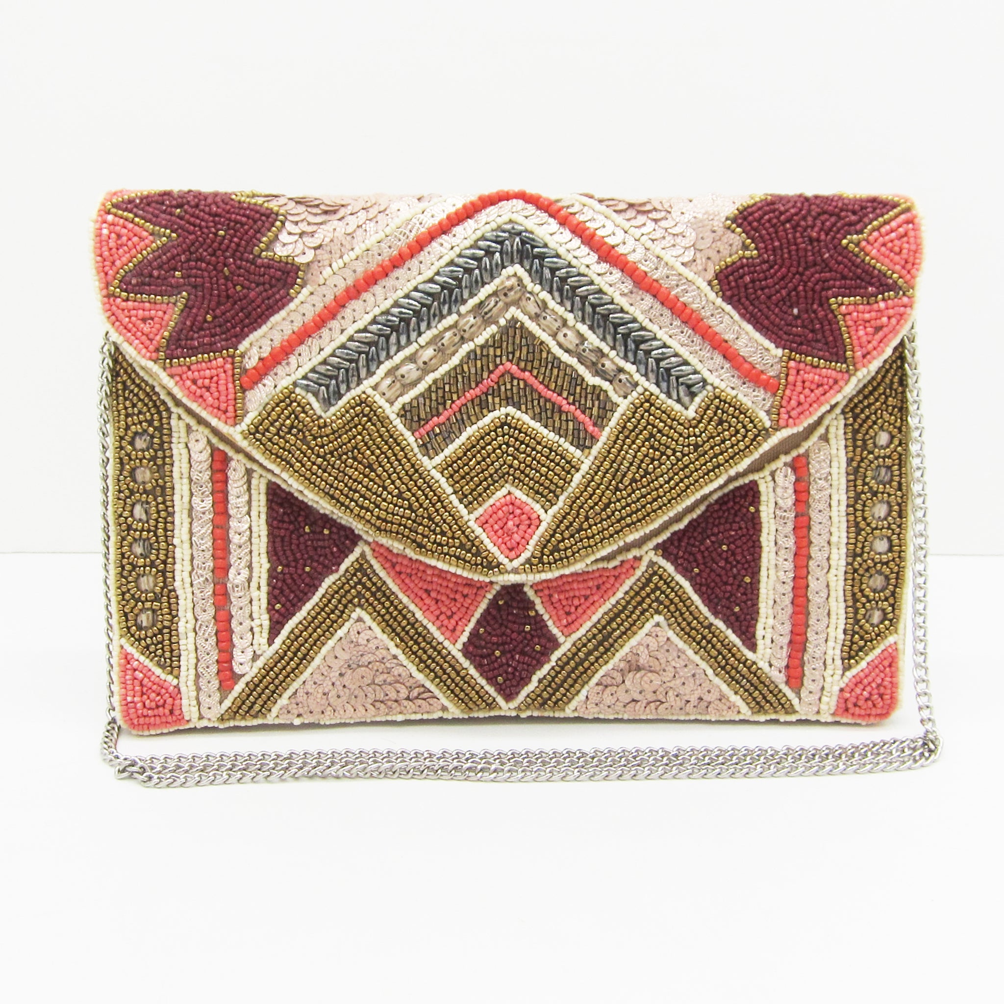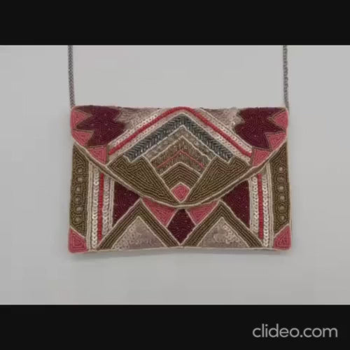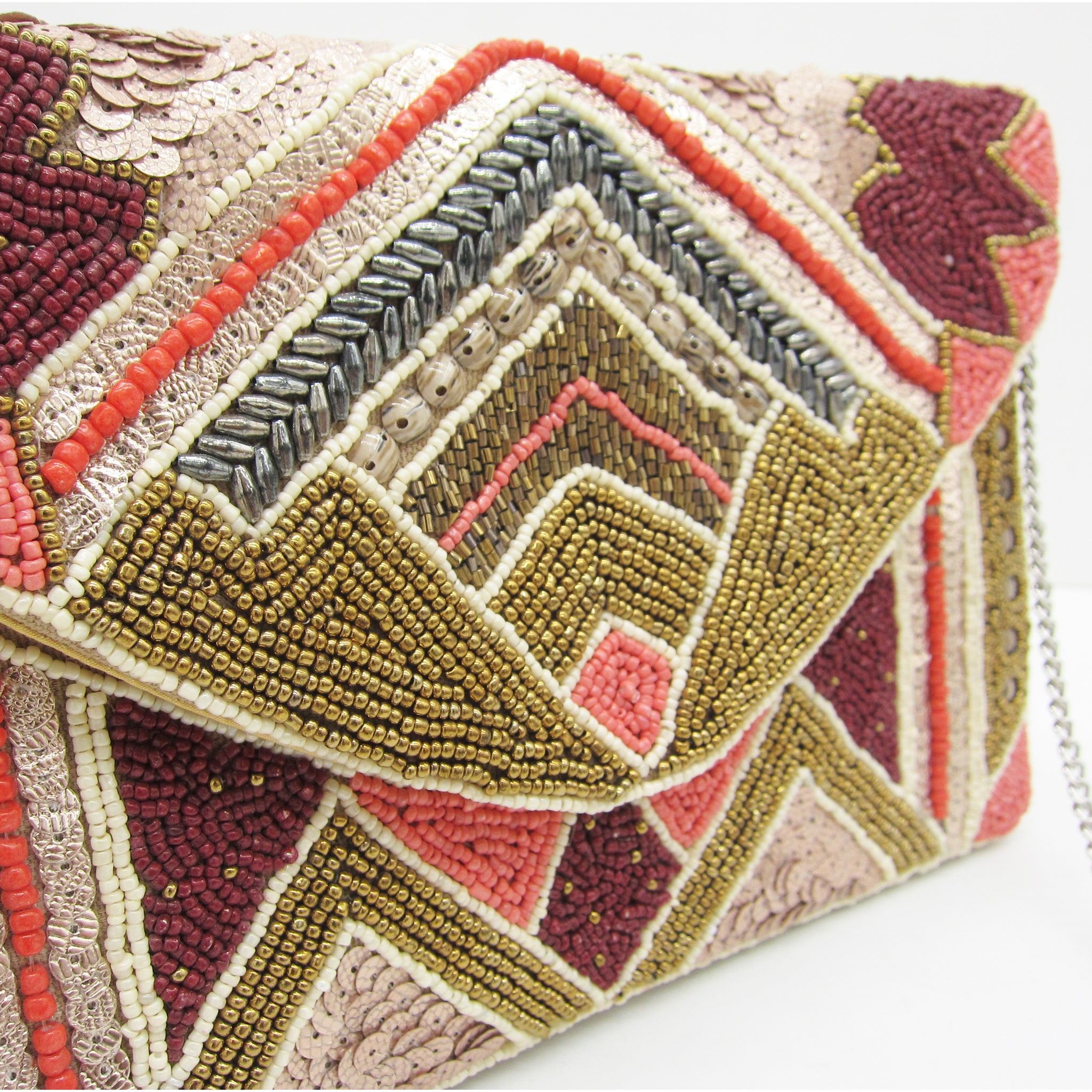 Covered with thousands of hand-sewn beads and sequins in warm coral, gold, ivory, and burgundy tones, this bag brings a luxurious boho-art-deco feel to any outfit.